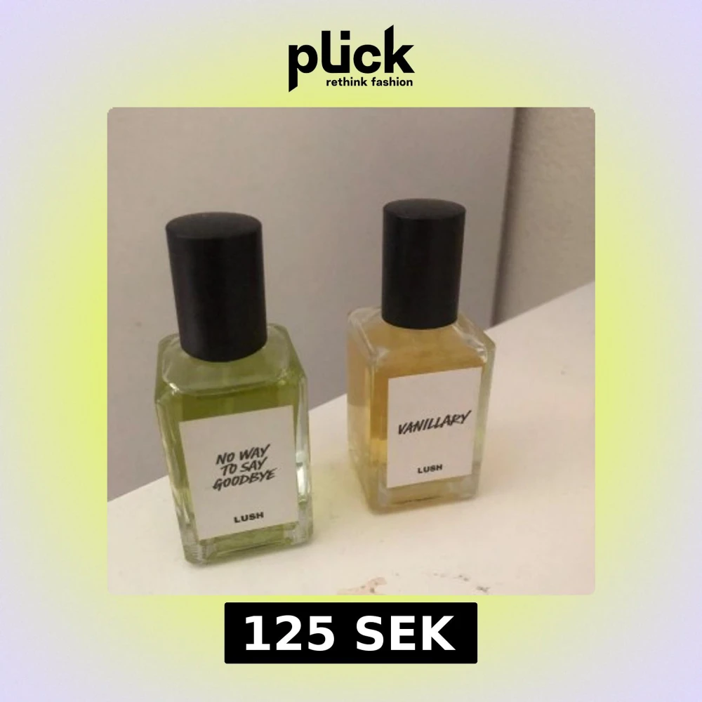 Två parfymer från Lush: No Way To Say Goodbye med grön ton och Vanillary med gul ton. Båda i rektangulära glasflaskor med svarta korkar och vita etiketter med svart text.
