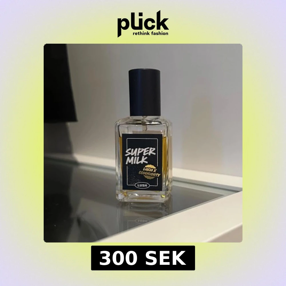 Super Milk parfym från Lush i en genomskinlig, fyrkantig glasflaska med svart etikett och svart lock. Parfymen har en gulaktig vätska och modern design. Perfekt för dig som gillar unika dofter och snygga flaskor.