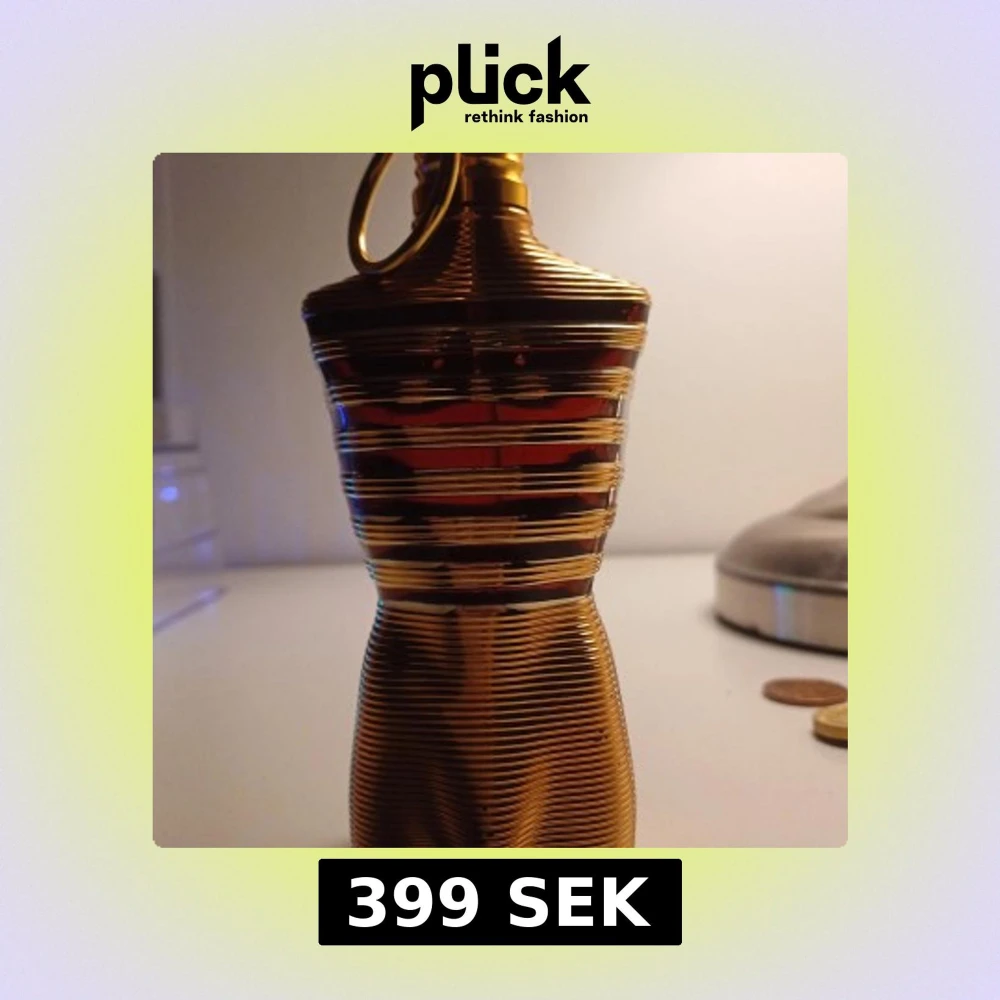 Säljer en elegant parfymflaska från Jean Paul Gaultier, Le Male Elixir. Flaskan har en unik design i guld med horisontella ränder och en stilren form. Perfekt för den som vill ha en lyxig doftupplevelse.