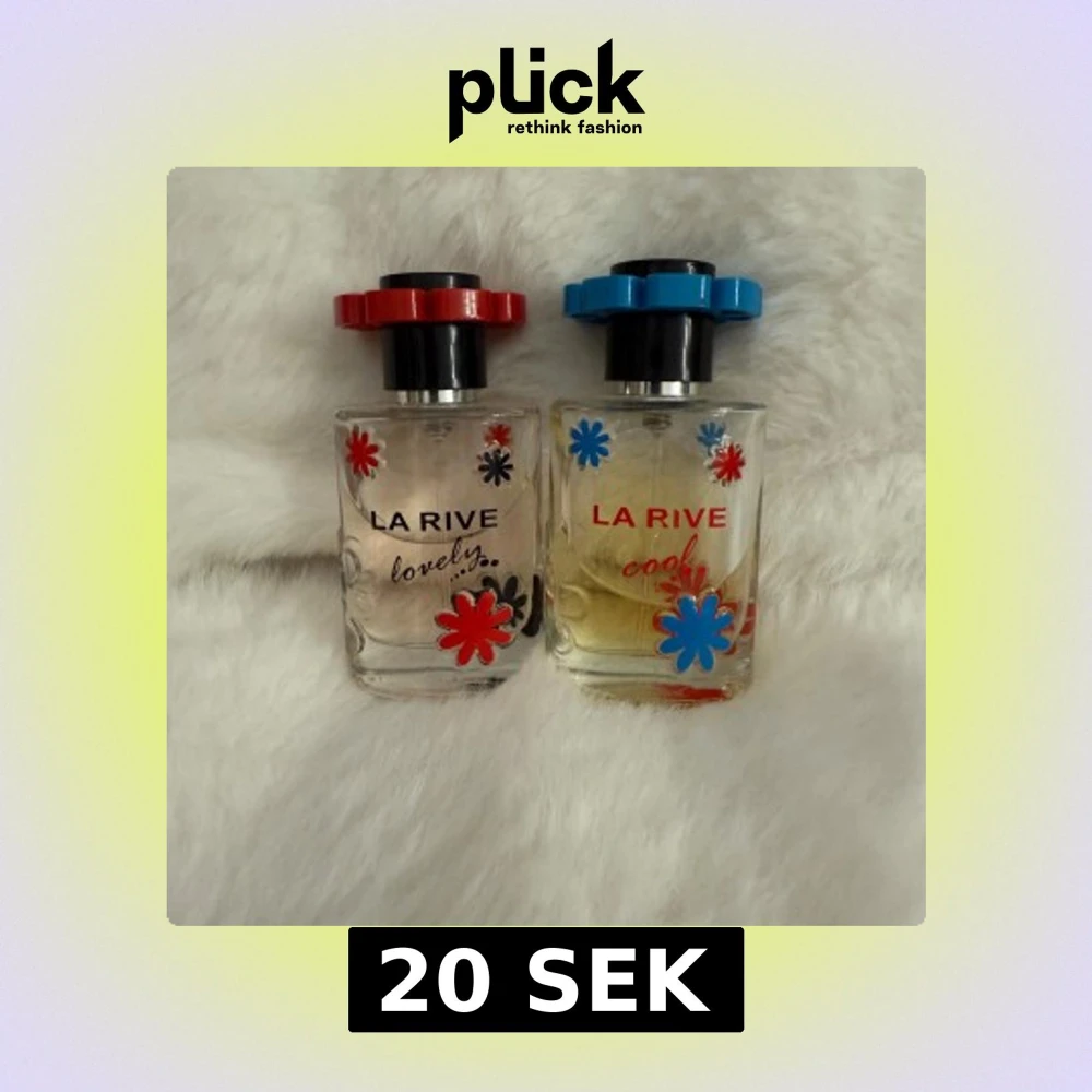 Två flaskor parfym från La Rive: Lovely och Cool. Båda flaskorna är dekorerade med färgglada blommor och har runda lock, ett rött och ett blått. Flaskorna är genomskinliga och har sprayfunktion. Perfekt för dig som gillar lekfull design och fräscha dofter.