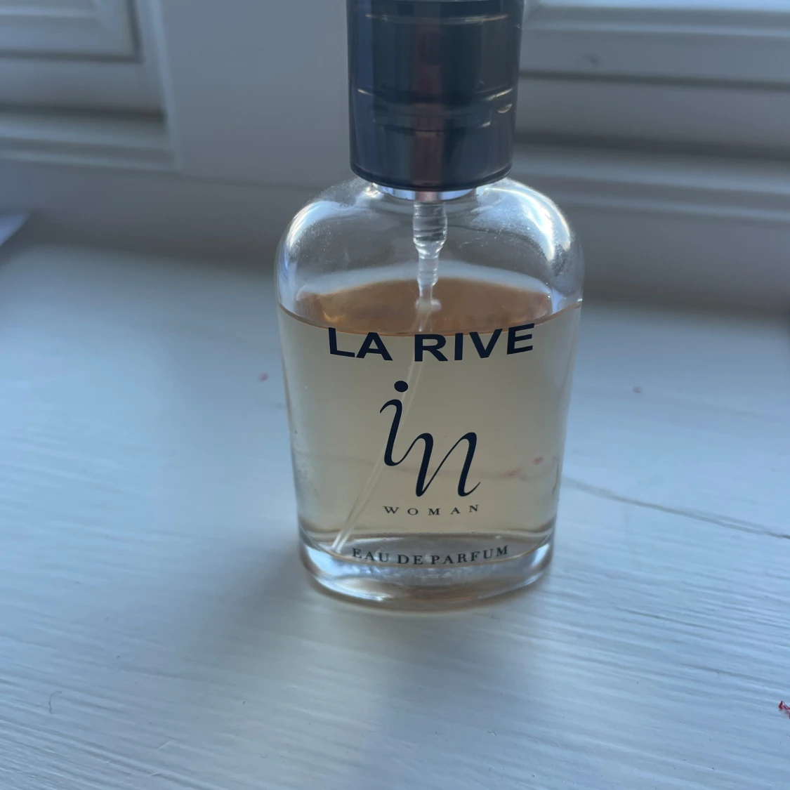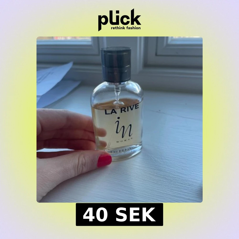 Säljer en elegant flaska La Rive In Woman Eau de Parfum. Flaskan är genomskinlig med svart text och en svart kork. Perfekt för den som söker en sofistikerad doftupplevelse. Köpt på normal och säljer p.g.a att den inte kommer till användning längre.