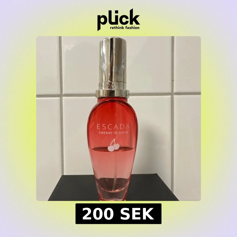 Säljer en elegant parfymflaska från Escada med doften 'Cherry in Japan'. Flaskan är röd och har en stilren design med ett silverfärgat lock. Perfekt för den som älskar fruktiga och blommiga dofter. 🍒