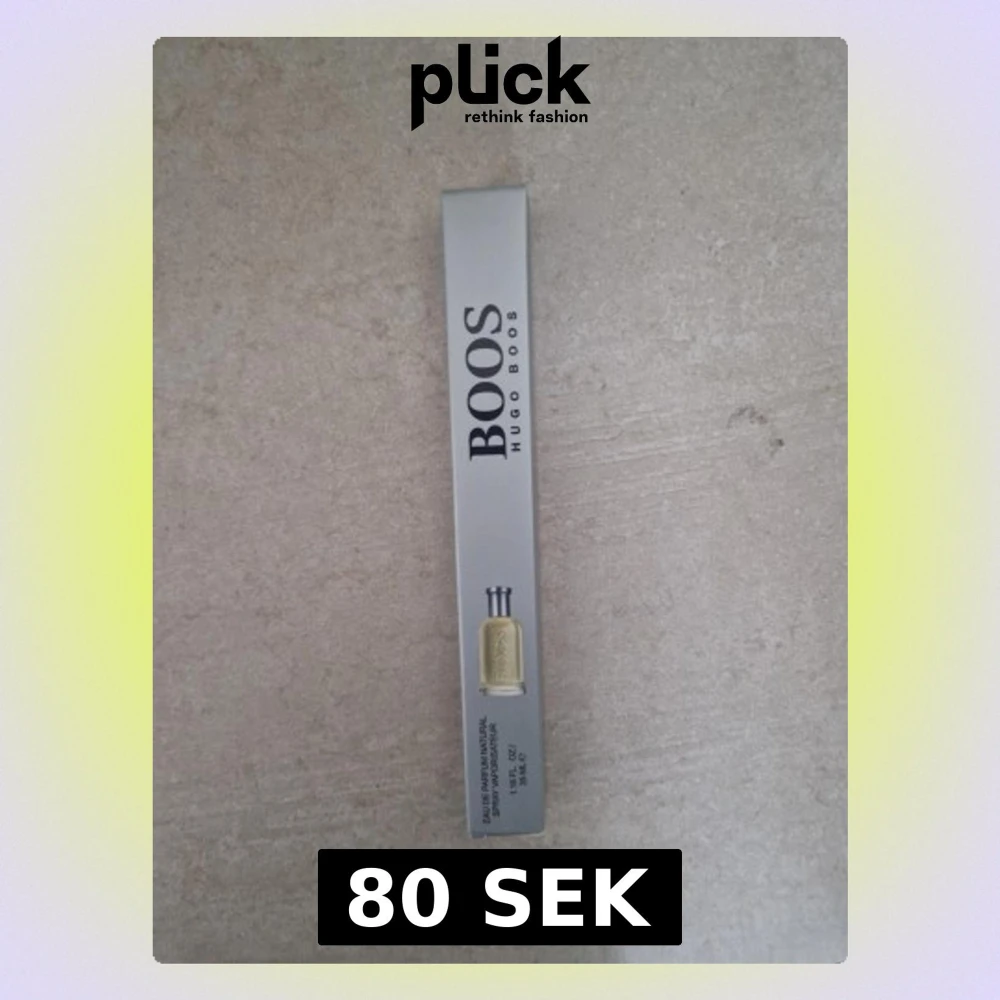 Parfym från Hugo Boos i en smal, silverfärgad kartong med svart text. Flaskan på förpackningen är guldfärgad och rymmer 35 ml. Perfekt storlek att ta med i väskan och stilren design som passar alla.