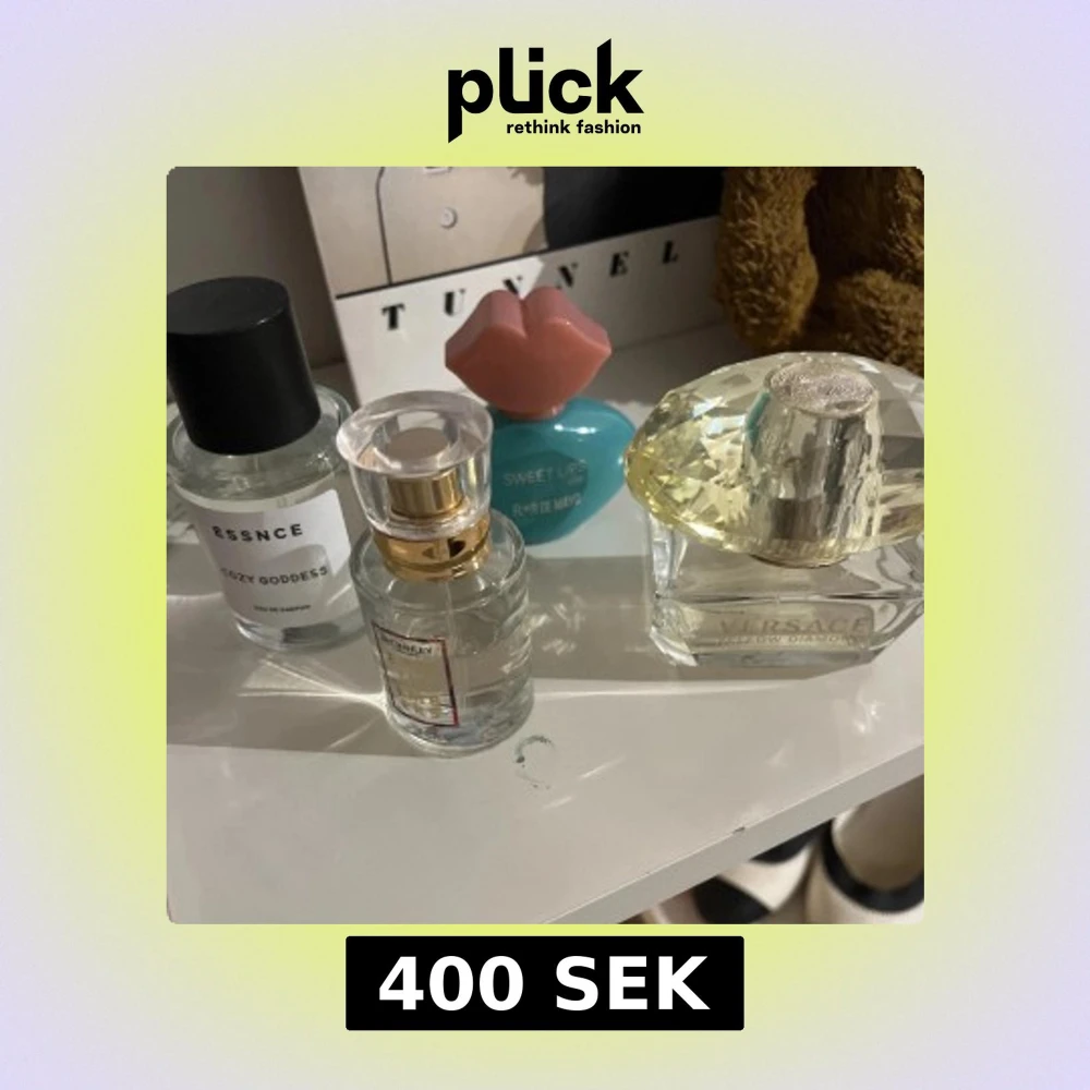 En samling av parfymer med olika märken och unika flaskdesigner. Inkluderar en flaska med rosa läppformad kork, en fyrkantig flaska med gulddetaljer, och en elegant flaska från Versace med genomskinlig och gul design. Perfekt för den som älskar att variera sina dofter.
