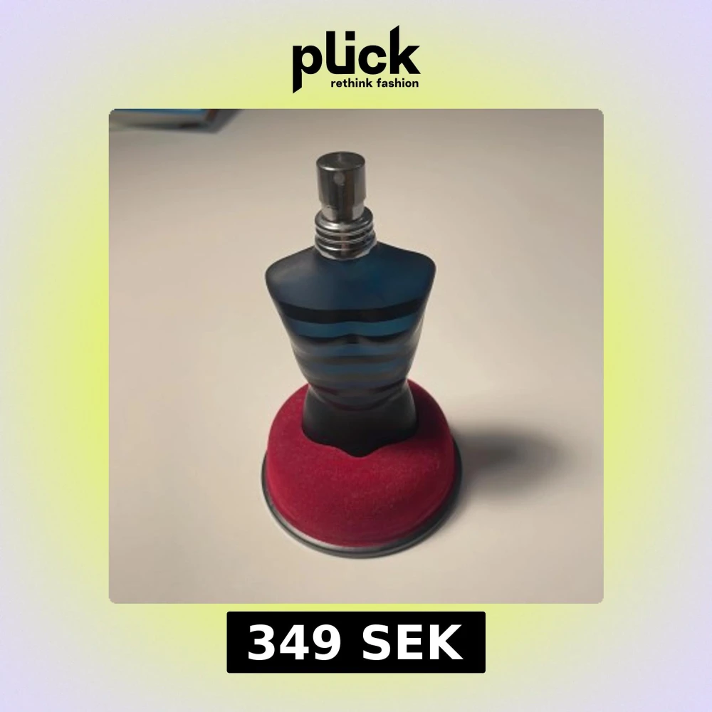 Säljer en Jean Paul Gaultier Ultra Male parfym i den ikoniska flaskan formad som en manlig torso. Flaskan är matt mörkblå med svarta ränder och har en metallisk spraytopp. Kommer med original svart cylinderförpackning med röd text.