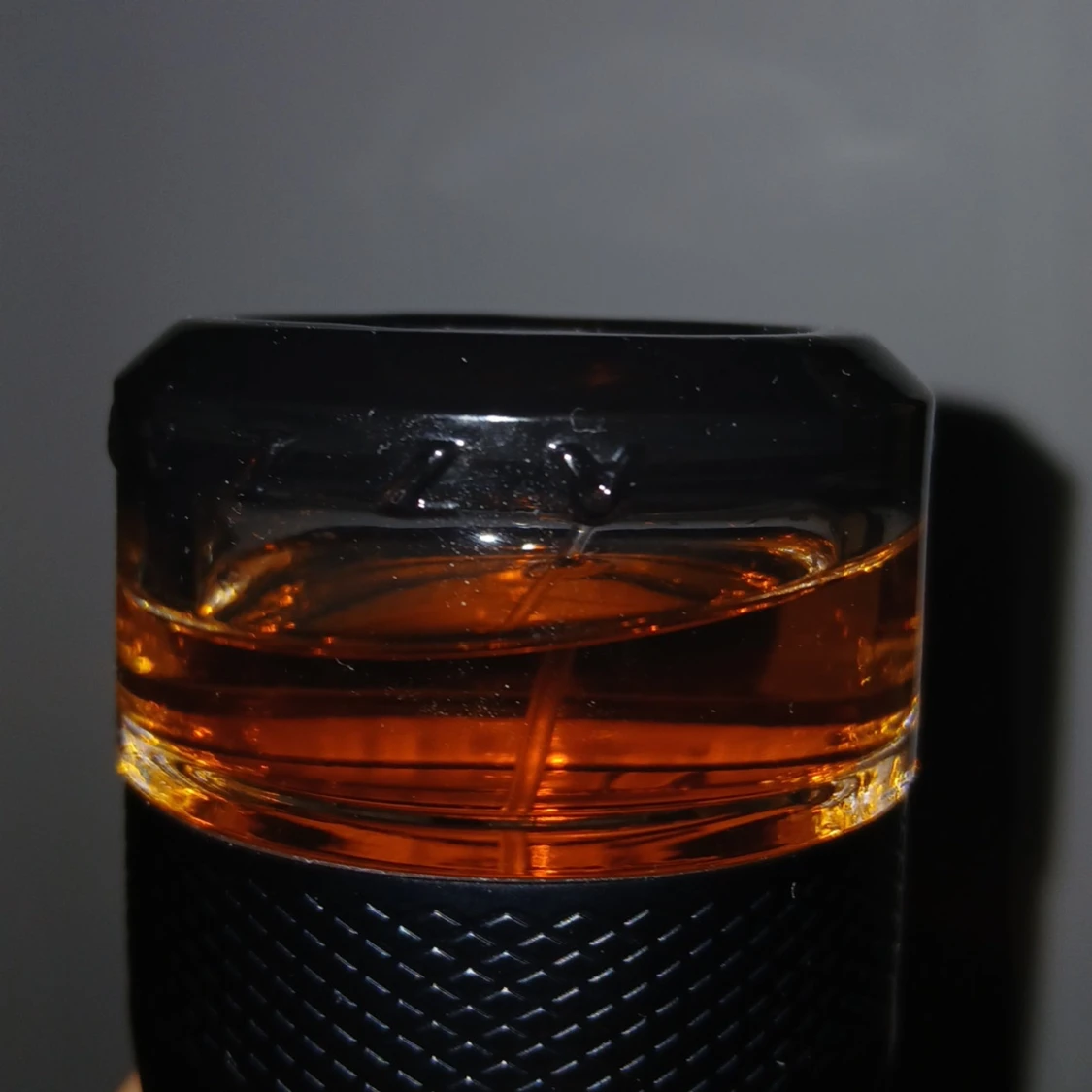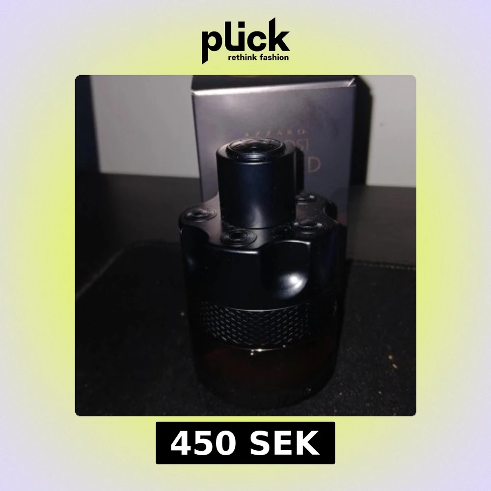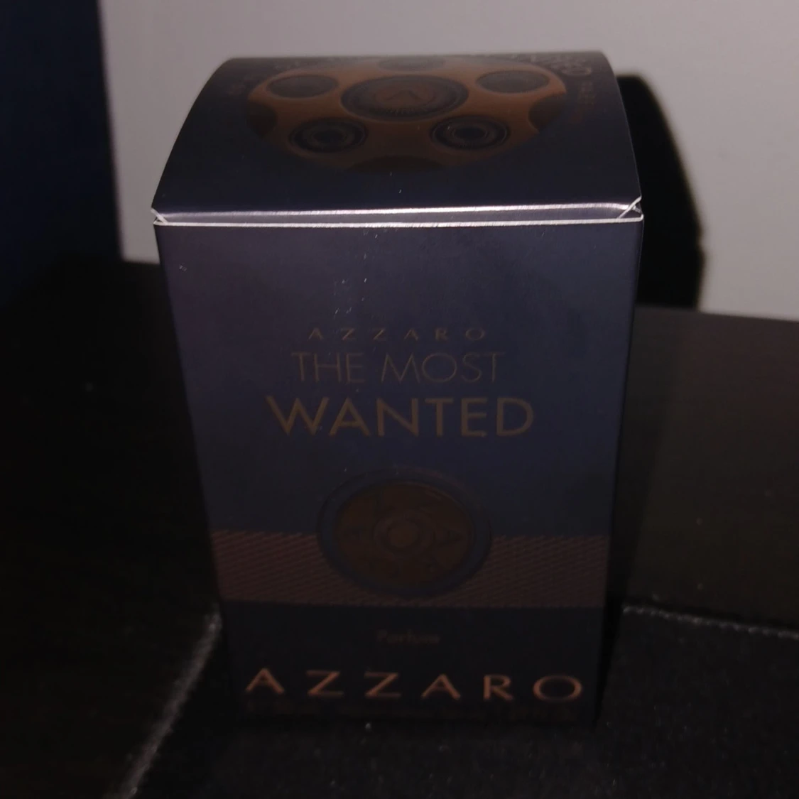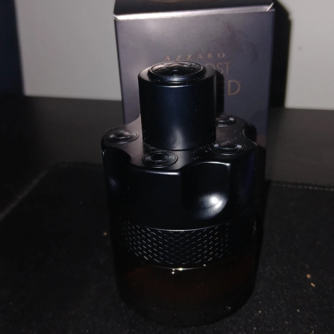 Säljer en flaska Azzaro The Most Wanted parfym. Flaskan har en unik design med en mörk, stilren look och en texturerad yta. Parfymen kommer i en elegant förpackning som ger en lyxig känsla. Perfekt för den som vill ha en distinkt och minnesvärd doft.