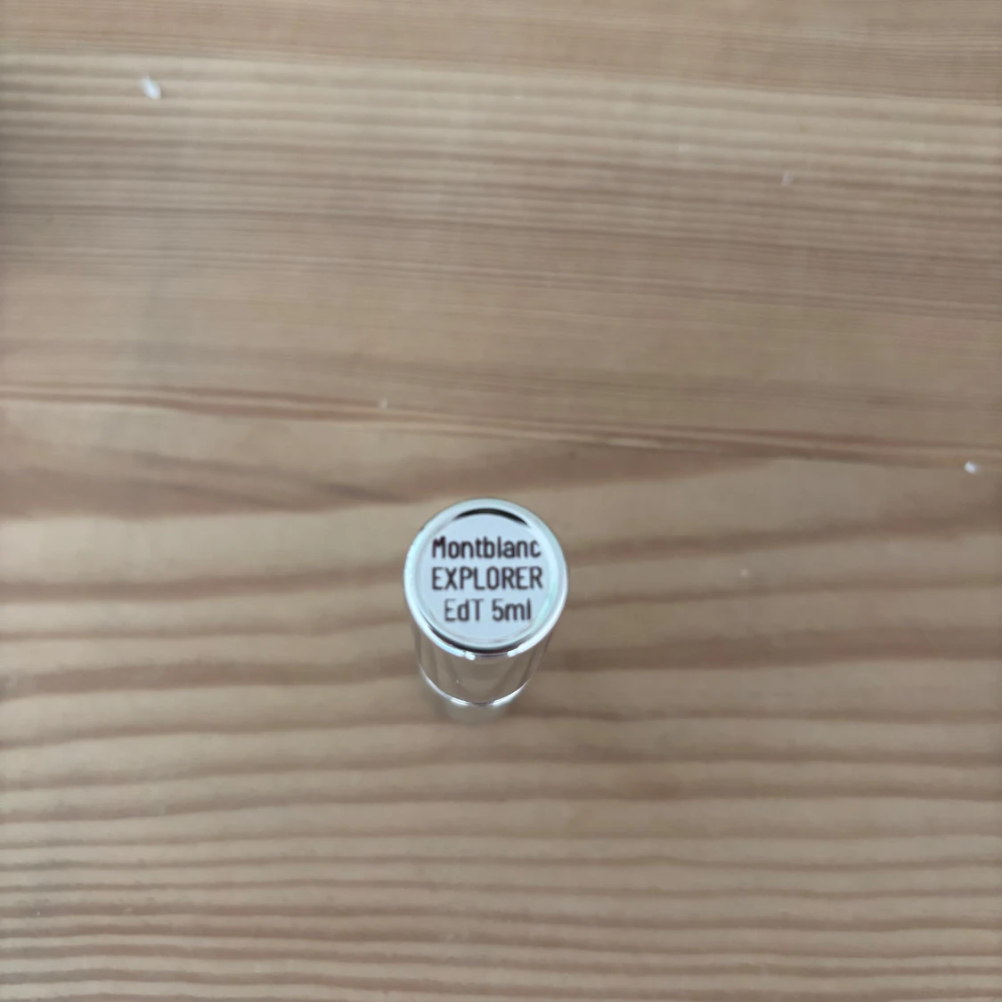 Montblanc Explorer Eau de Toilette i en smidig 5ml miniflaska. Flaskan är cylinderformad och har en snygg, blank silverfärgad yta med två diskreta linjer runt mitten. Perfekt att ha med sig i väskan för en fräsch doft när som helst.