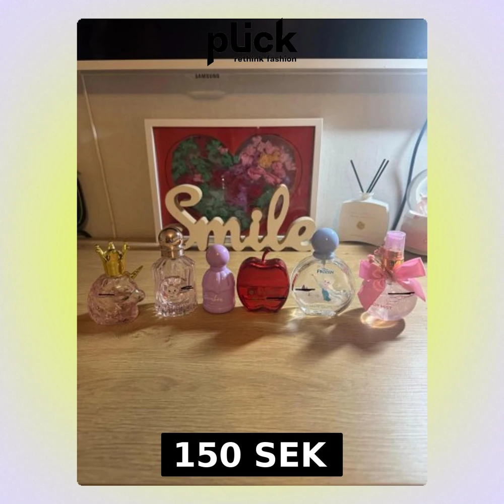 Säljer ett parfymset med sex olika flaskor i unika former och färger. Bland annat finns en Unicorn parfym , en röd äppelformad flaska och en Frozen-parfym, och hello Kitty parfym och rosa body och hair mist .Perfekt för dig som gillar gulliga och färgglada parfymer.