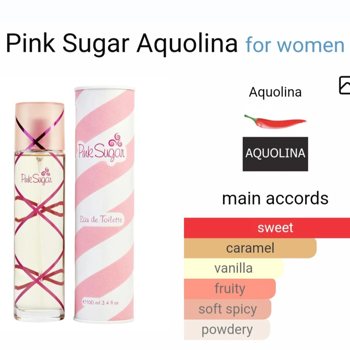 Pink Sugar från Aquolina är en söt och lekfull parfym med toner av karamell, vanilj och frukt. Flaskan är cylinderformad i glas med rosa dekor och ett pastellrosa lock. Perfekt för dig som gillar dofter som påminner om godis och sockervadd.(Ca 1 ml använt)