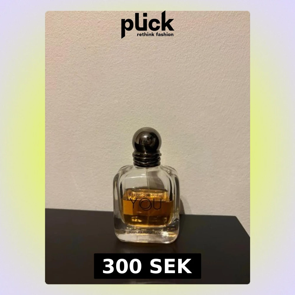 Emporio Armani Stronger With You är en elegant parfym i en genomskinlig glasflaska med rundade former och en silverfärgad metallkork. Doften har en varm bärnstensfärgad vätska och flaskan har stilren svart text på framsidan.