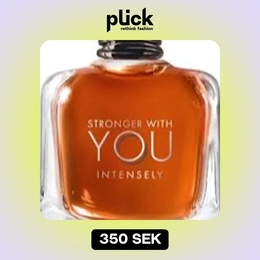 Säljer en flaska av Emporio Armanis 'Stronger With You Intensely'. Den har en djup bärnstensfärg och kommer i en elegant glasflaska med svart kork. Perfekt för den som vill ha en intensiv och långvarig doft. Passar både till vardags och speciella tillfällen.