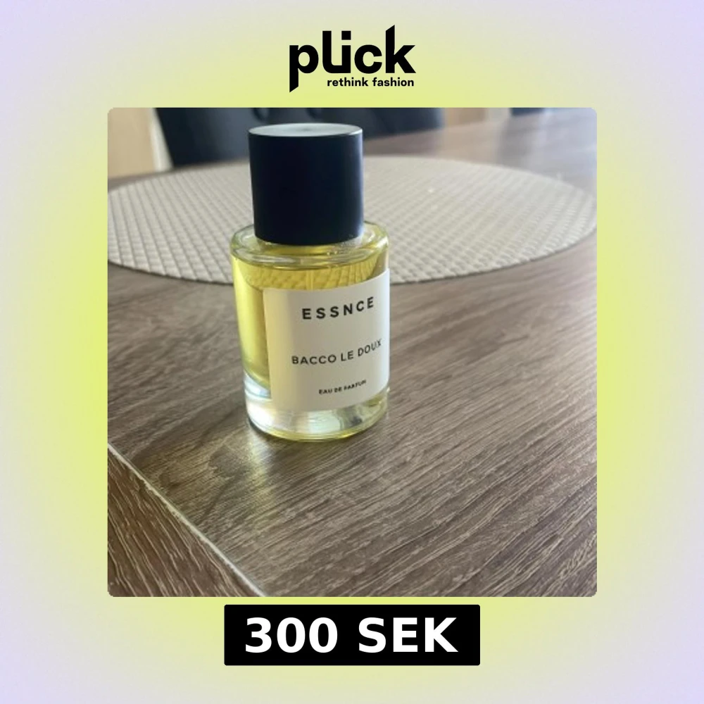 Parfymflaska med gul vätska från ESSNCE, doften heter Bacco Le Doux. Flaskan är rund med svart lock och vit etikett med svart text. 50ml och Max använt 10 sprut. Doupe av Tom Ford tobacco vanille. Gillar du Tom Ford så är denna parfym för dig.