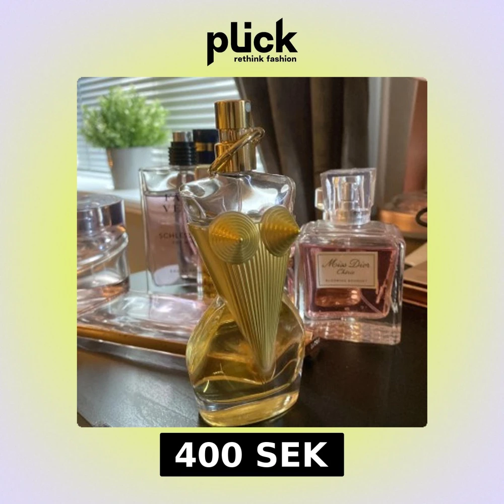 Ikonisk parfymflaska från Jean Paul Gaultier formad som en kvinnokropp med guldiga detaljer och konformad byst. Flaskan är genomskinlig med ljusgul vätska inuti och har en unik, konstnärlig design som verkligen sticker ut på parfymhyllan. 50ml. Nästan full.