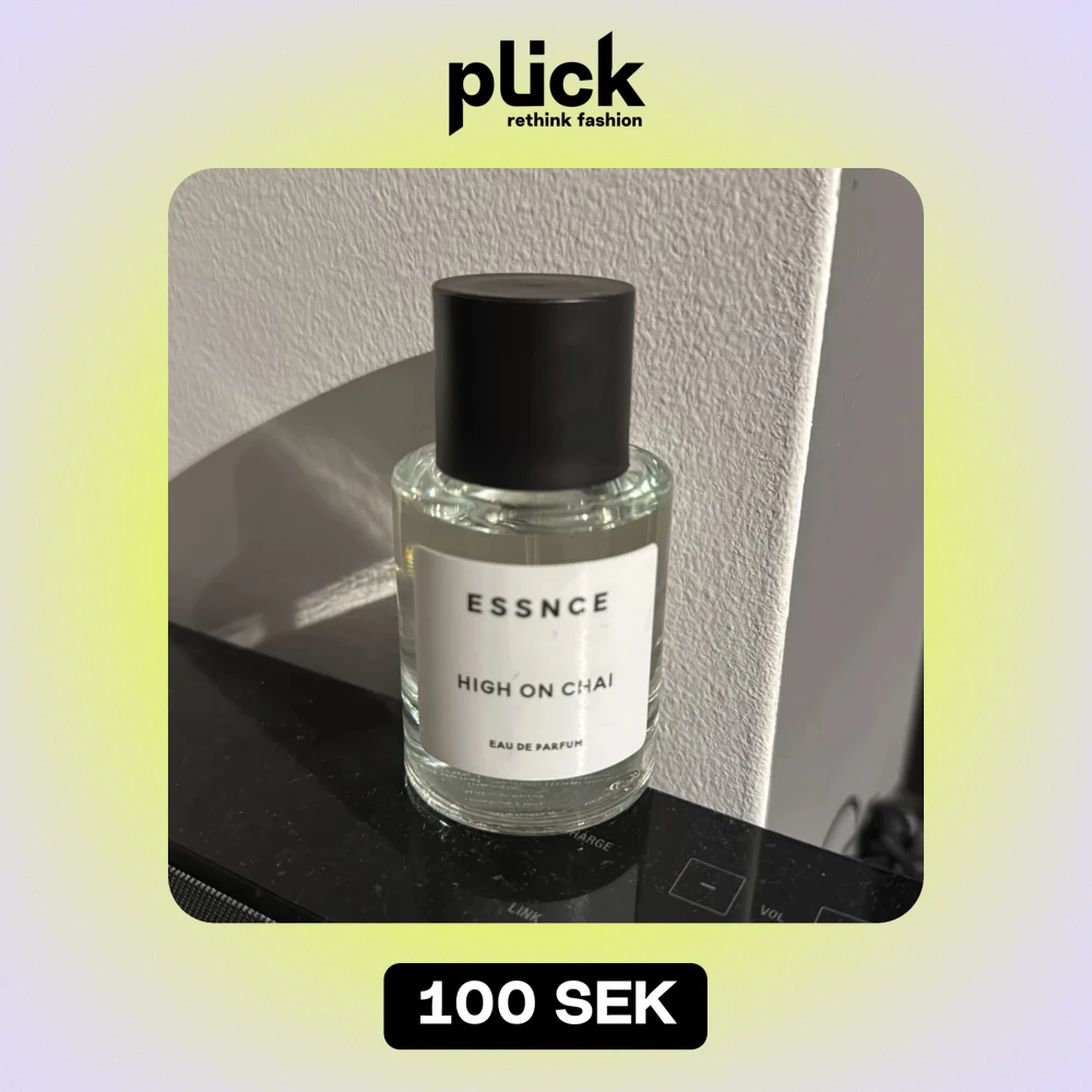 Säljer en flaska Essnce High on Chai Eau de Parfum. Den har en stilren och minimalistisk design med en genomskinlig glasflaska och svart lock. Perfekt för dig som älskar doften av chai och vill ha något unikt i din parfymkollektion. Flaskan är i gott skick och redo att användas. Passa på att köpa denna doftupplevelse!