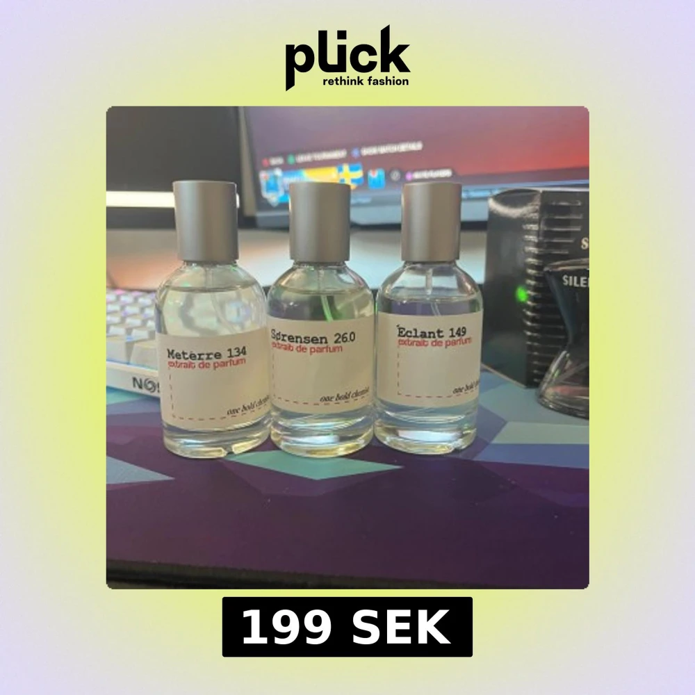 Säljer tre exklusiva parfymer från One Bold chemist: Meterre 134, Sørensen 26.0 och Éclant 149. Varje flaska har en minimalistisk design med en genomskinlig glasflaska och en stilren grå kork. Perfekt för den som vill ha en unik doftupplevelse.