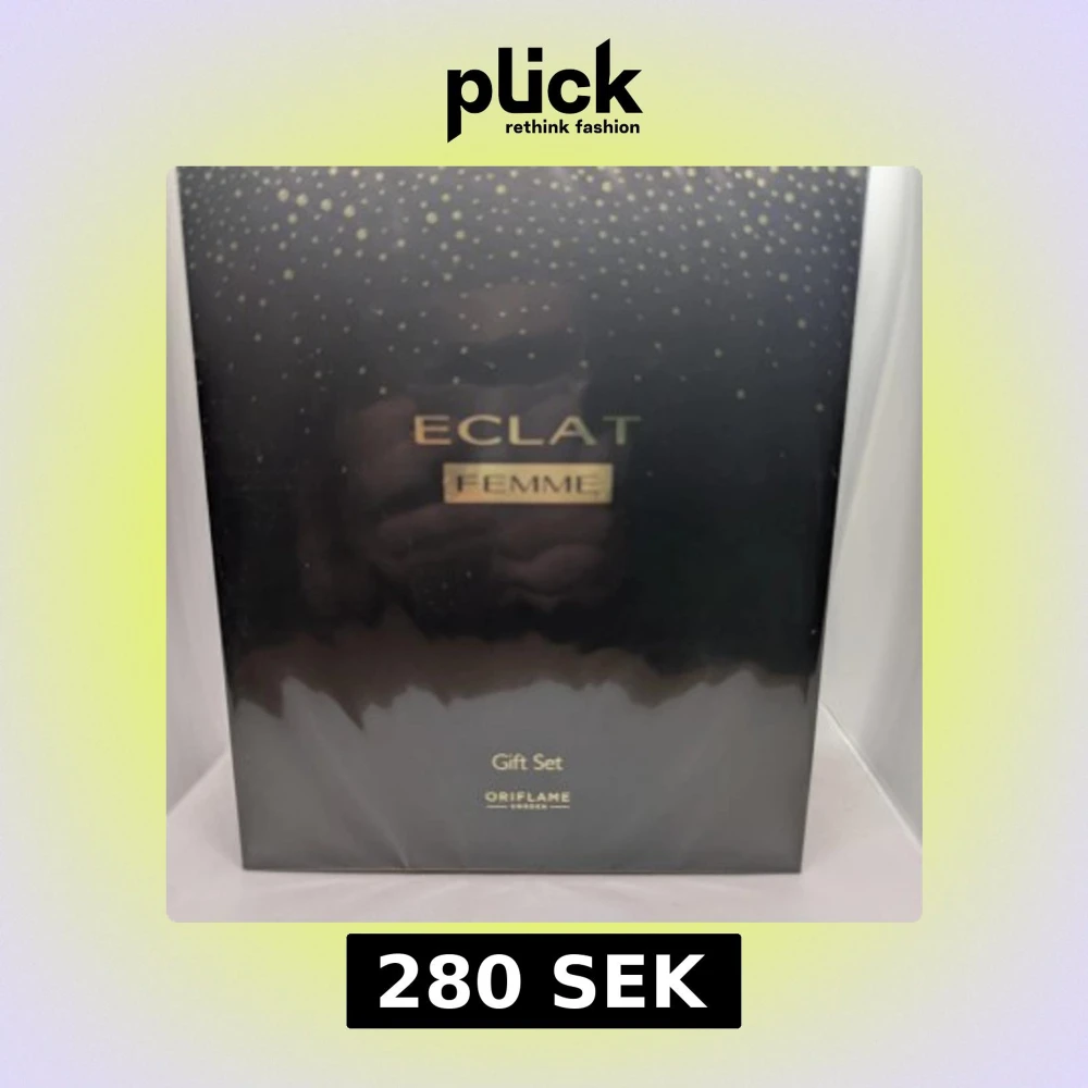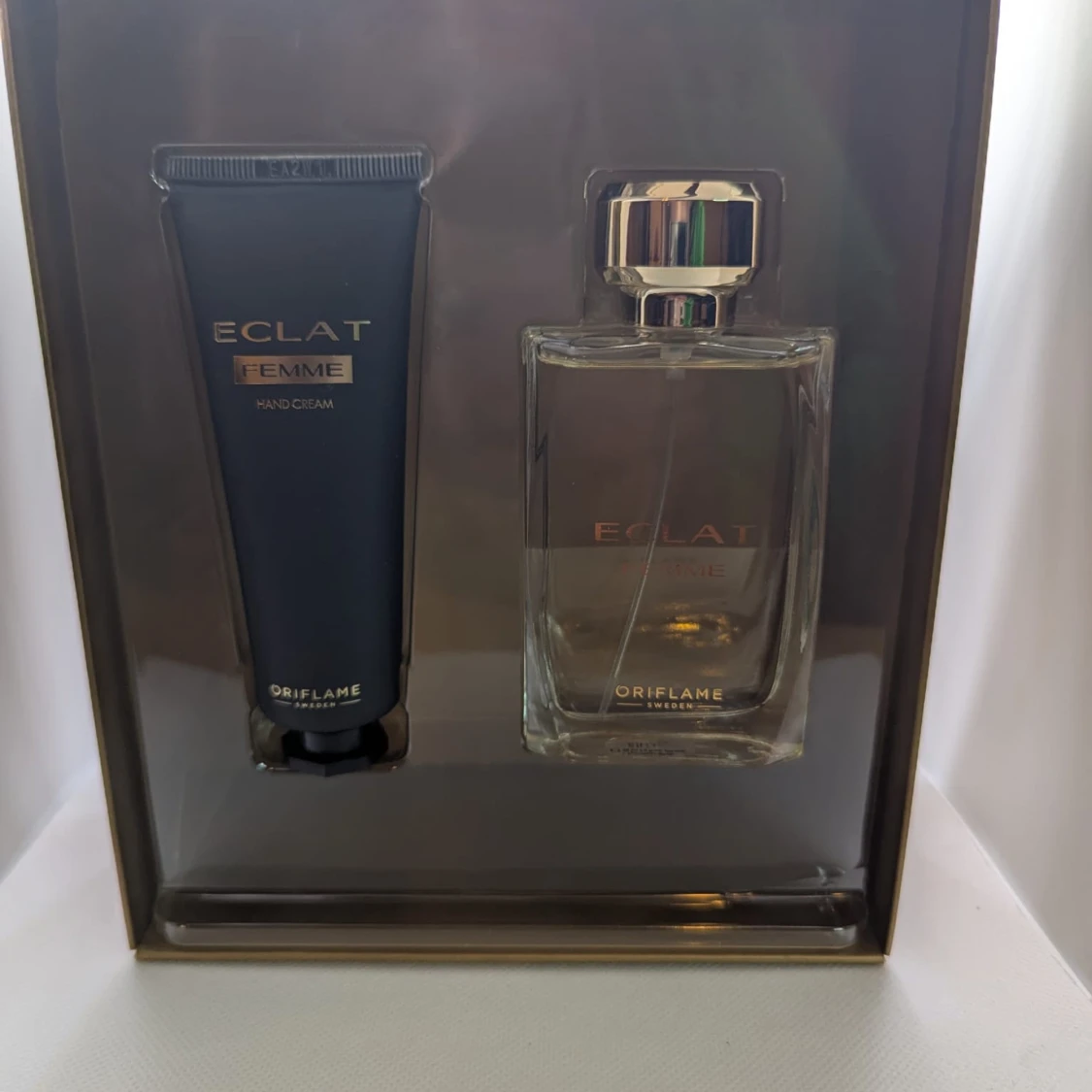 Snygg presentbox med Eclat Femme parfym och matchande handkräm från Oriflame. Perfekt för dig som vill ha en stilren och lyxig känsla i vardagen. Tillverkad i Sverige.