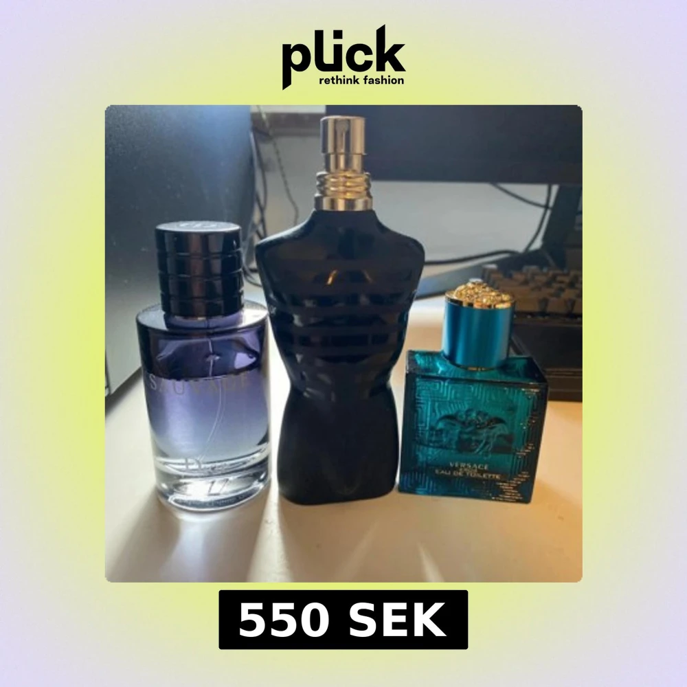 Mängd syns på bilderna. JPG har lite kvar, kanske 5-10ml. Säljer tre ikoniska herrparfymer: Dior Sauvage i en stilren blå-lila glasflaska, Versace Eros i en turkosblå kvadratisk flaska med Medusa-detalj och metallock, samt Jean Paul Gaultier Le Male i svart kroppformad flaska med silverdetaljer.