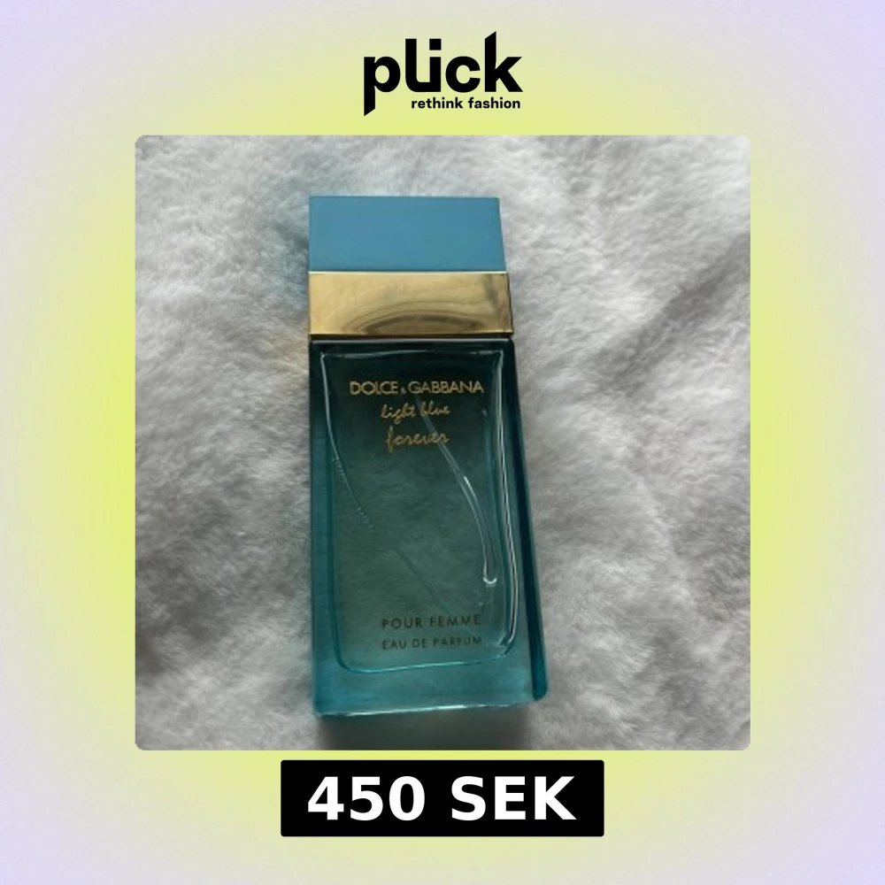 En elegant parfym i en rektangulär glasflaska med turkosblå färg och gulddetaljer. Flaskan har ett stilrent utseende med blått lock och guldlist. Doften är en Eau de Parfum för kvinnor. Använd ca 1/5 eller mindre.