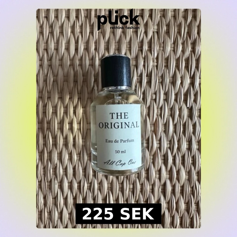 En stilren parfymflaska från All Cap One med texten 'The Original'. Flaskan är genomskinlig med svart plastlock och vit etikett. Innehåller 50 ml Eau de Parfum. Enkel och modern design som passar perfekt på hyllan. Passar både tjejer och killar, doft av vanilj. Aldrig använd!