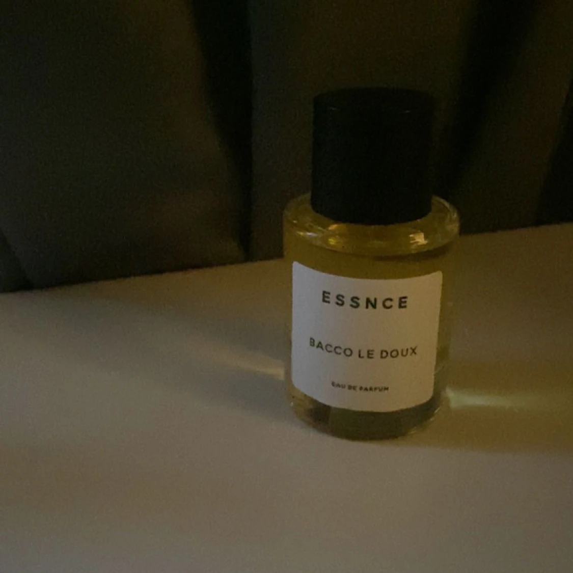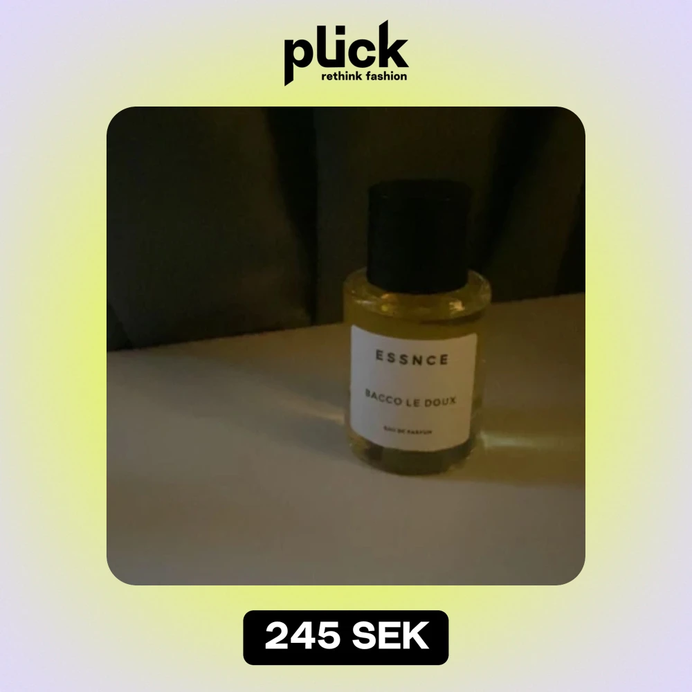 Säljer en elegant parfymflaska från ESSNCE med doften BACCO LE DOUX. Flaskan är genomskinlig med en enkel vit etikett och svart text. Den har en svart kork och en stilren design som passar perfekt på sminkbordet. Perfekt för den som älskar en sofistikerad och unik doft.
