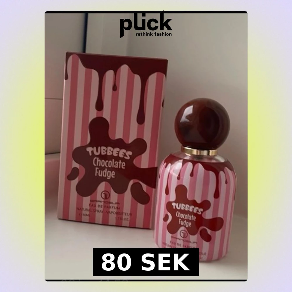Säljer en Tubbees Chocolate Fudge parfym med söt design i rosa och brunt. Flaskan har ett randigt mönster och chokladinspirerade detaljer samt en rund brun kork. Doften är inspirerad av chokladfudge och flaskan rymmer 50 ml.