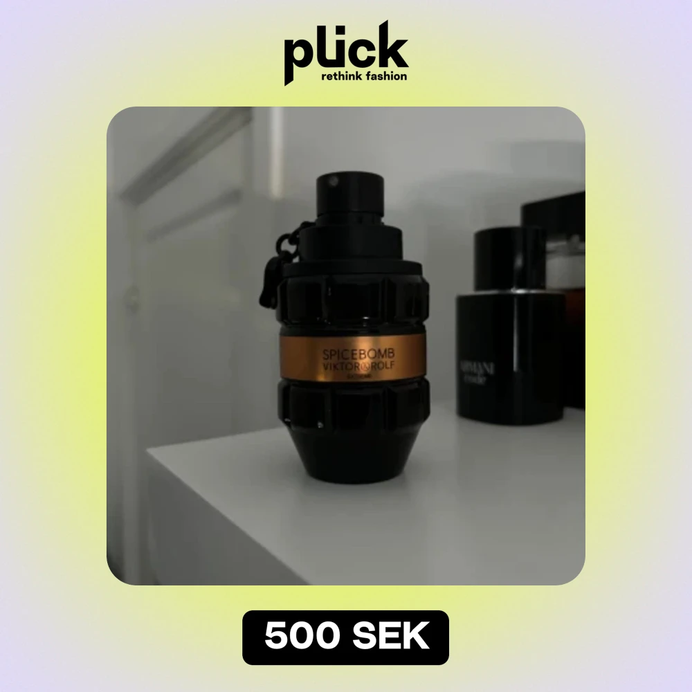 En parfymflaska från Viktor & Rolf med namnet Spicebomb. Flaskan är svart med en kopparfärgad etikett och har en unik design som påminner om en handgranat.