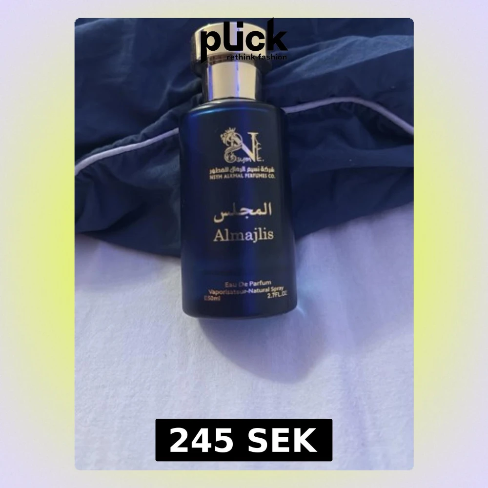 Säljer en lyxig parfymflaska, Almajlis Eau De Parfum från N5th Almajlis Perfumes Co. Flaskan är svart med gulddetaljer och rymmer 50 ml. Perfekt för dig som gillar exklusiva dofter och snygg design.