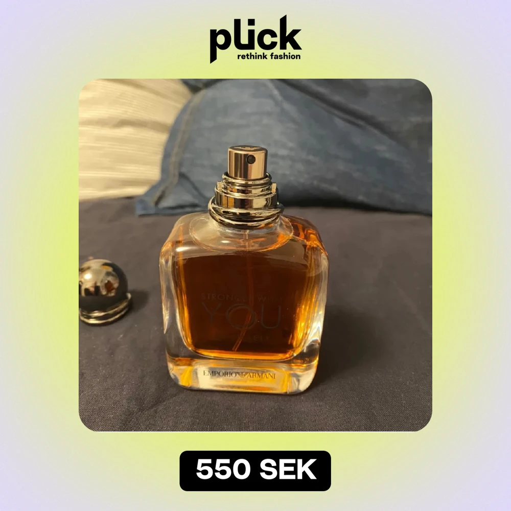 Säljer en elegant parfymflaska av Stronger With You Intensely från Emporio Armani. Flaskan är i glas med en varm bärnstensfärgad vätska och har en stilren, rundad design. Perfekt för den som vill ha en intensiv och sofistikerad doft. Korken är metallisk och ger en lyxig känsla.