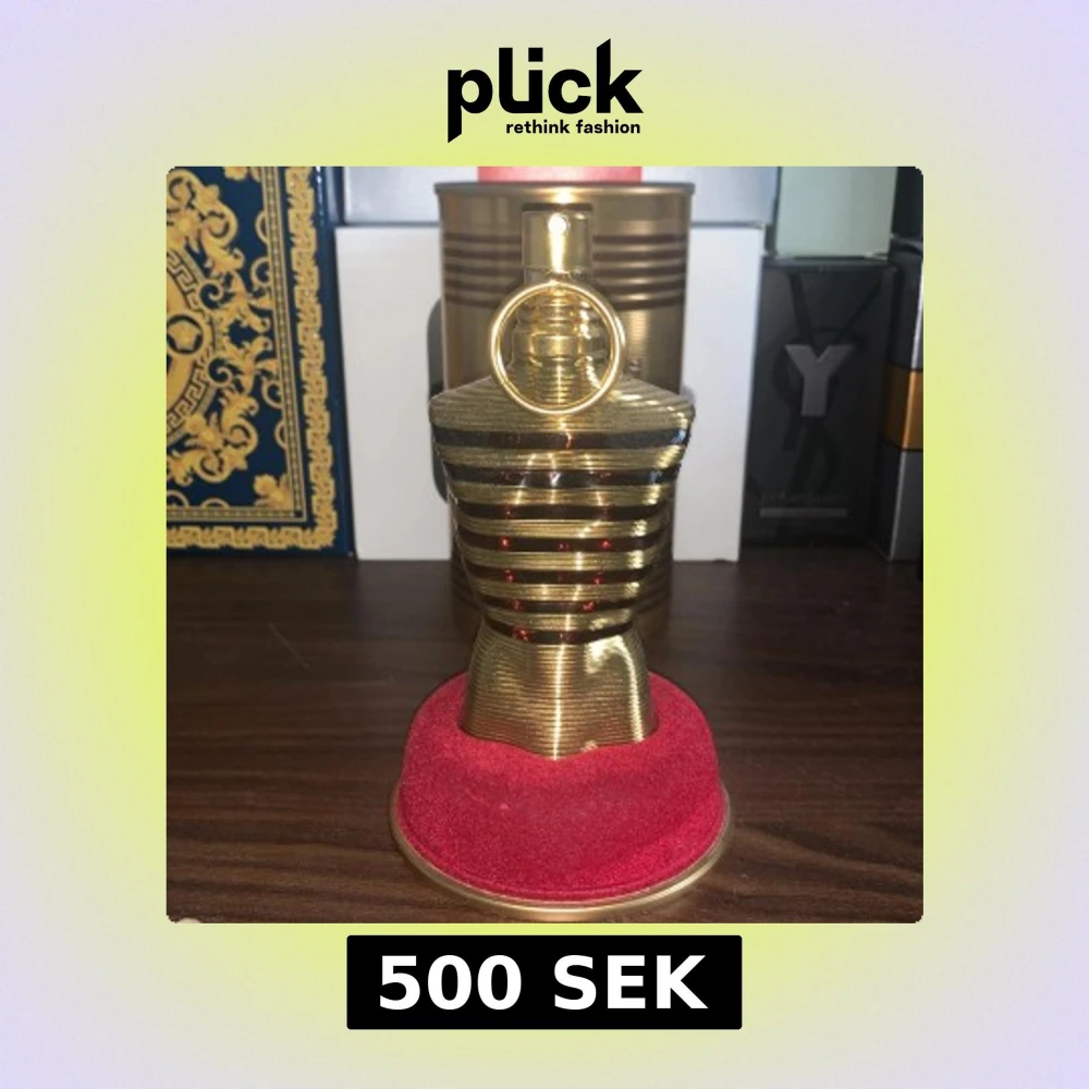 Exklusiv parfym i en elegant guldfärgad flaska formad som en manlig torso. Flaskan har horisontella ränder och en distinkt ringdetalj på korken. Förpackningen är en matchande guldfärgad metallburk med märkets logotyp och parfymens namn ingraverat. Säljer för 500 eftersom att den är lite använd men priset kan diskuteras, är även öppen för byten!