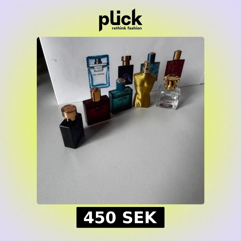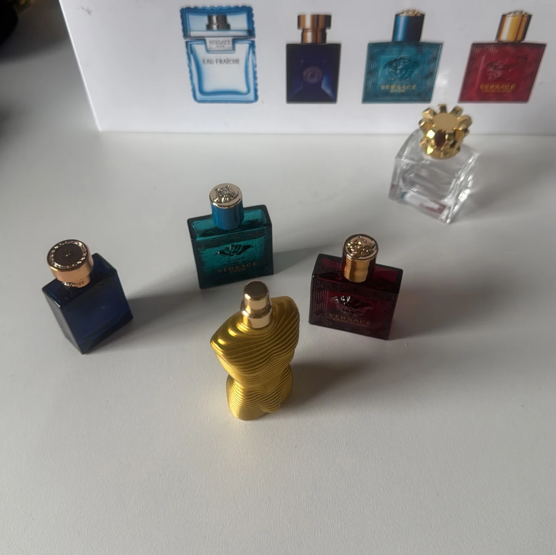 Säljer ett parfymset med fem miniflaskor: tre fyrkantiga Versace-flaskor i blått, rött och turkost glas med gulddetaljer, en genomskinlig flaska med guldkrona samt en ikonisk guldig Jean Paul Gaultier-flaska formad som en torso alla Versace parfymer är storsätt helt fulla och guldiga Jean Paul parfymen är vid midjan och Jean Paul dcamdsm är lite mindre än hälften alla luktar super gott .