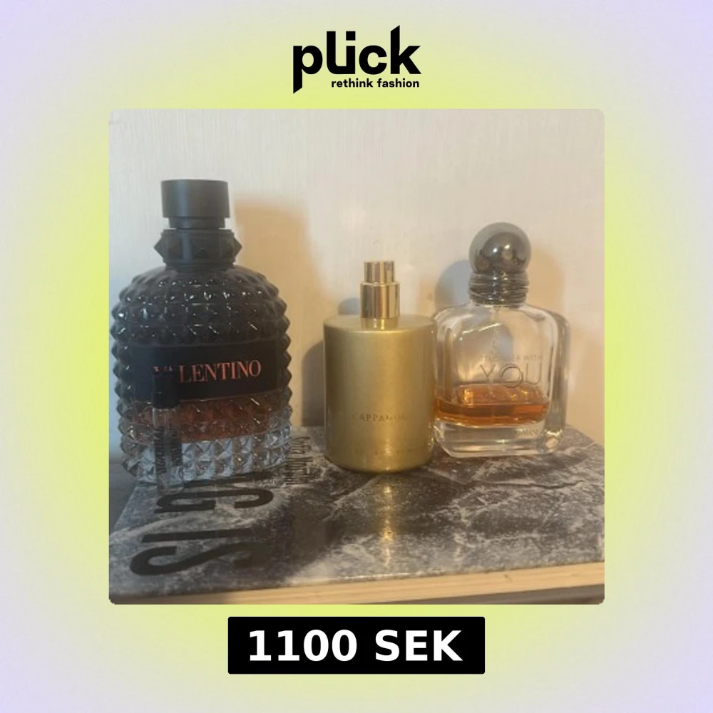 Säljer ett parfympaket med tre flaskor: Valentino Uomo i mörk, mönstrad glasflaska med svart kork, Giorgio Armani Stronger With You i genomskinlig fyrkantig flaska med silverkork, samt en liten provflaska Scandal från Jean Paul Gaultier. Snygga flaskor och ikoniska dofter, skicka meddelande om du vill köpa en av dem. Valentino -60 till 65 ml, stronger with you intensly -15 ml, cappadocia royal platinum - 48 ml, provdoft jean Paul scandal -1,5 ml