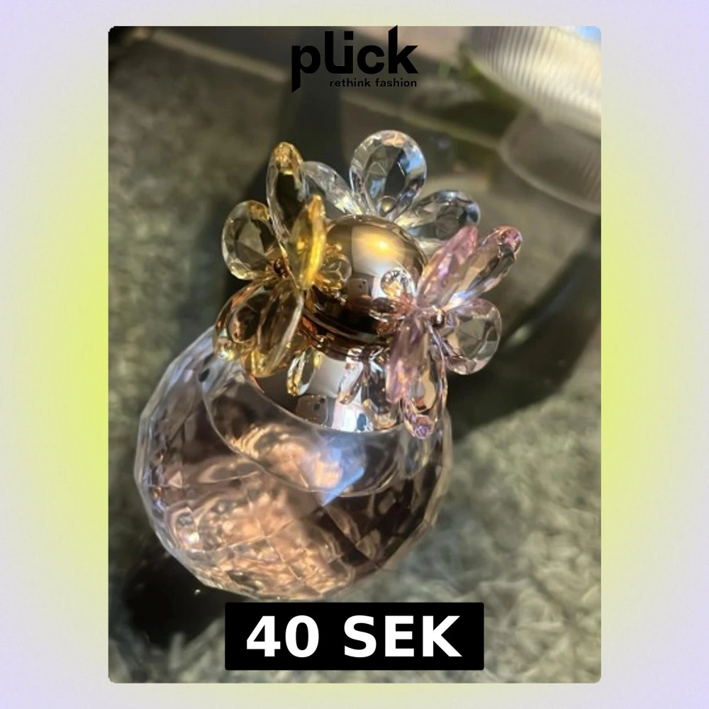 Unik parfymflaska i facetterat glas med en dekorativ kork formad som en blomma i transparent och ljuslila kristall. Flaskan har en rund, elegant form och detaljer i guld. Perfekt som inredningsdetalj eller för din favoritdoft.