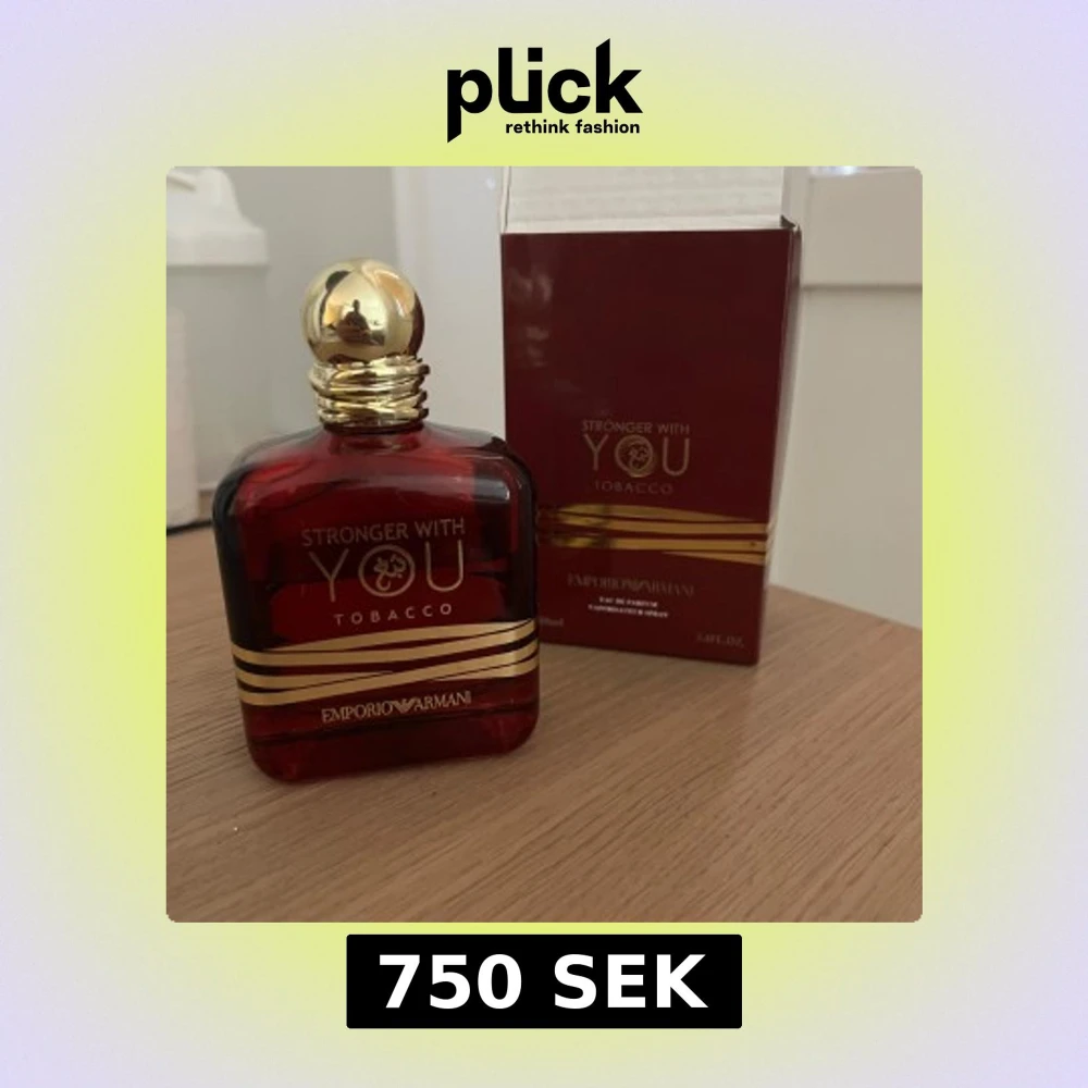 Emporio Armani Stronger With You Tobacco EdP i en lyxig mörkröd glasflaska med guldiga detaljer och rund guldfärgad kork. Flaskan rymmer 100 ml och har en elegant, maskulin design. Doften är kryddig och varm med tydliga tobaksnoter.