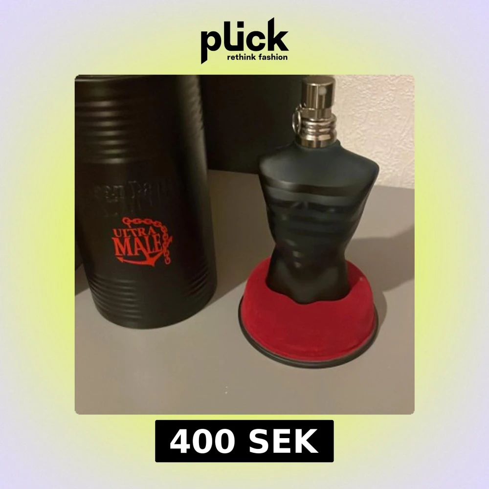 Jean Paul Gaultier Ultra Male Eau de Toilette Intense, 75 ml. Ungefär hela flaskan är fortfarande full. Flaskan har en cool svart design formad som en manlig torso med metallfärgat sprayhuvud. Kommer med en svart cylinderförpackning med röd text och en röd sammetsbas. Perfekt för dig som gillar unika och snygga flaskor.