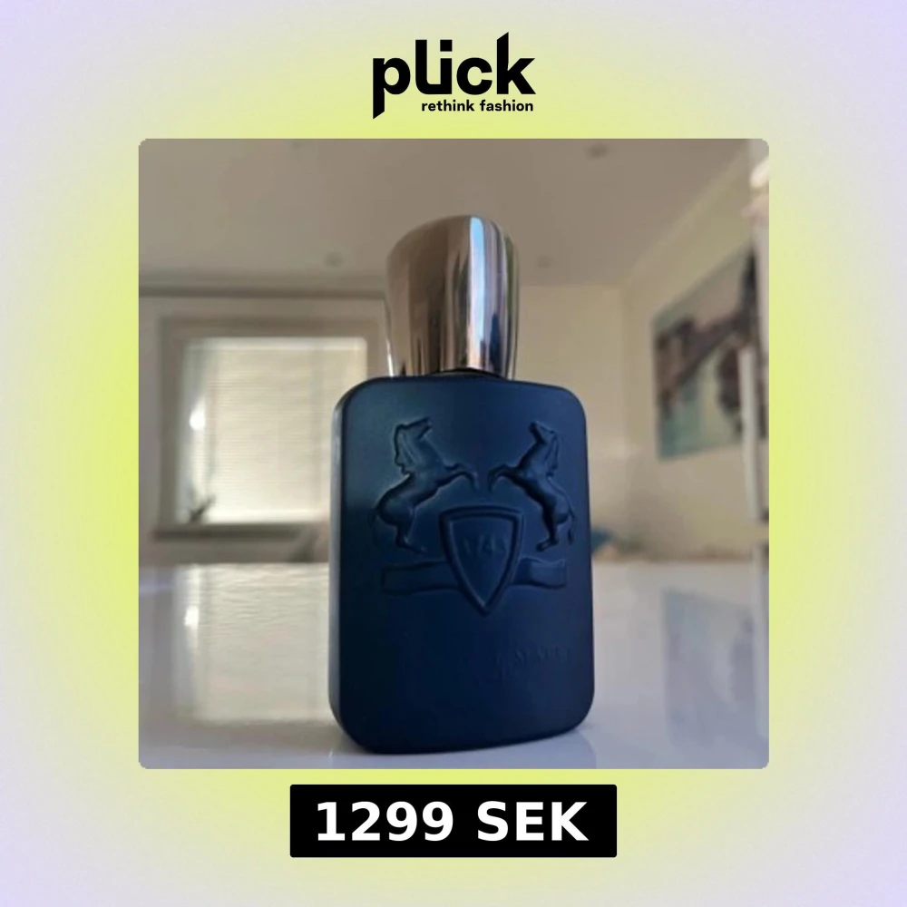 Elegant parfymflaska i mörkblått med silverfärgad kork från Parfums de Marly. Flaskan har en stilren design med två upphöjda hästar och en sköld på framsidan, vilket ger en lyxig känsla. Perfekt för den som söker en sofistikerad doftupplevelse. Det är ungefär 80% kvar av 75ml.