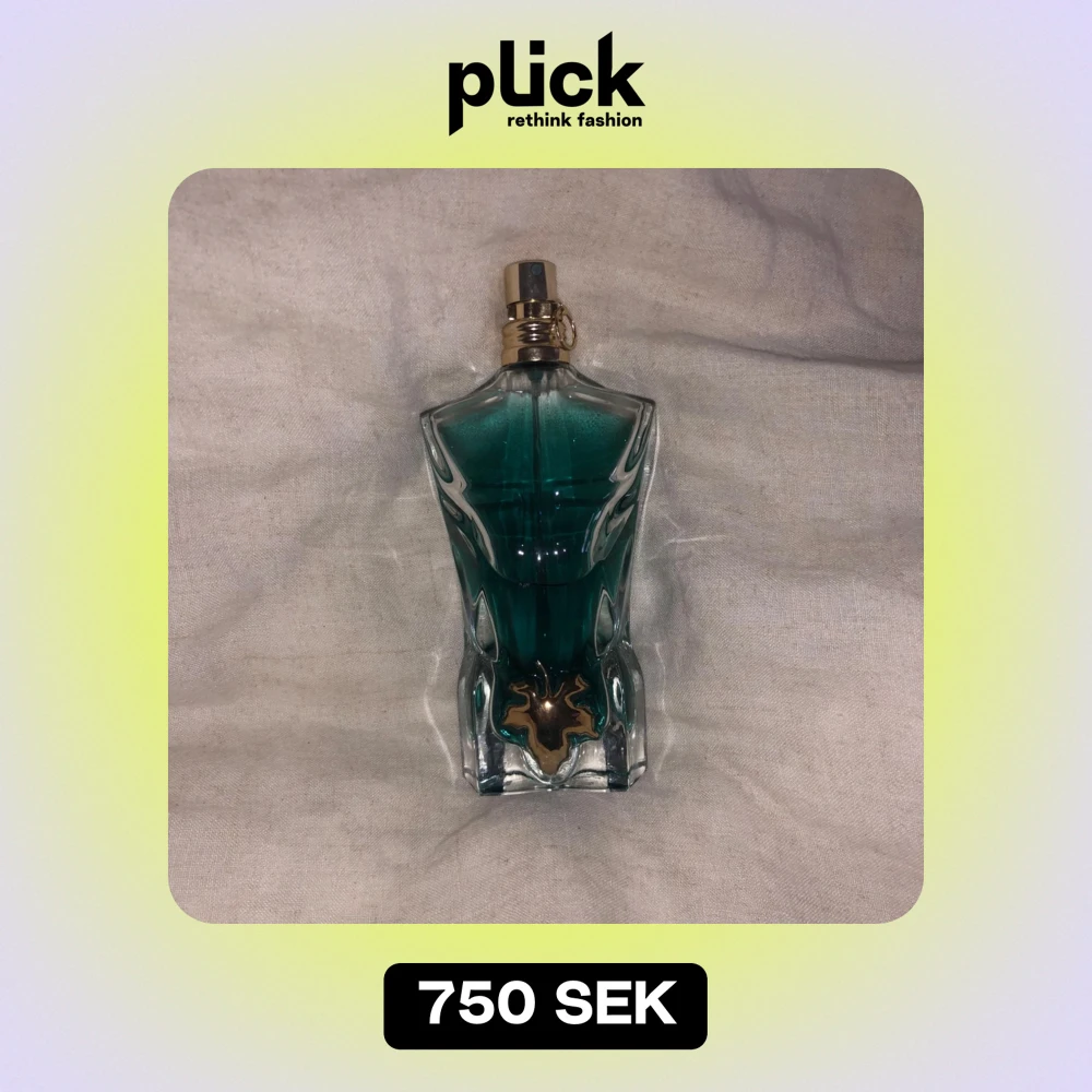 Säljer en flaska Le Beau Eau de Toilette från Jean Paul Gaultier. Flaskan är formad som en manlig torso i en cool grön färg med en guldig detalj framtill. Den står på en röd bas och kommer med en snygg grön förpackning. Perfekt för den som vill ha en unik och stilren parfymflaska i sin samling!