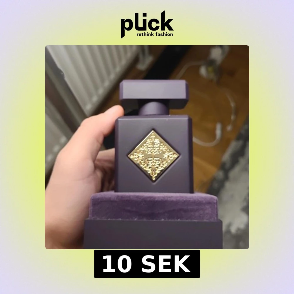 Elegant parfymflaska i en djup lila nyans med en fyrkantig form. Flaskan har en dekorativ gulddetalj i form av en diamant på framsidan. Den kommer i en matchande lila förpackning med sammetsliknande yta.