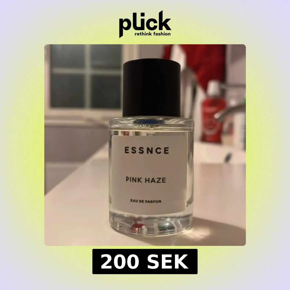 Säljer en flaska Essnce Pink Haze Eau de Parfum. Flaskan är genomskinlig med en stilren vit etikett och svart text. Den luktar gott, knappt använd för det var inte riktigt min grej.