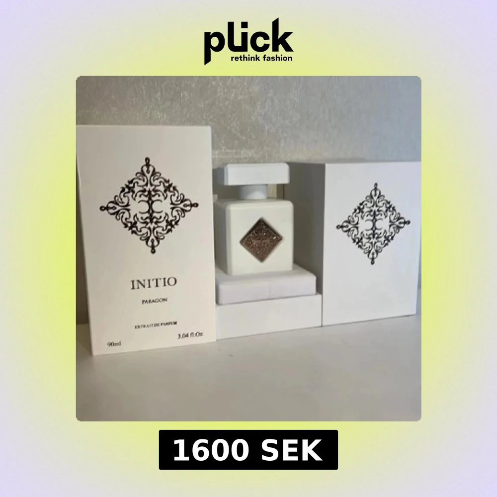 Lyxig parfym från Initio, Paragon Extrait de Parfum i 90ml flaska. Flaskan är mattvit med en fyrkantig form och har en bronsfärgad dekorativ detalj på framsidan samt ett matchande lock med bronsplatta. Kommer i elegant vit förpackning med svart mönster.