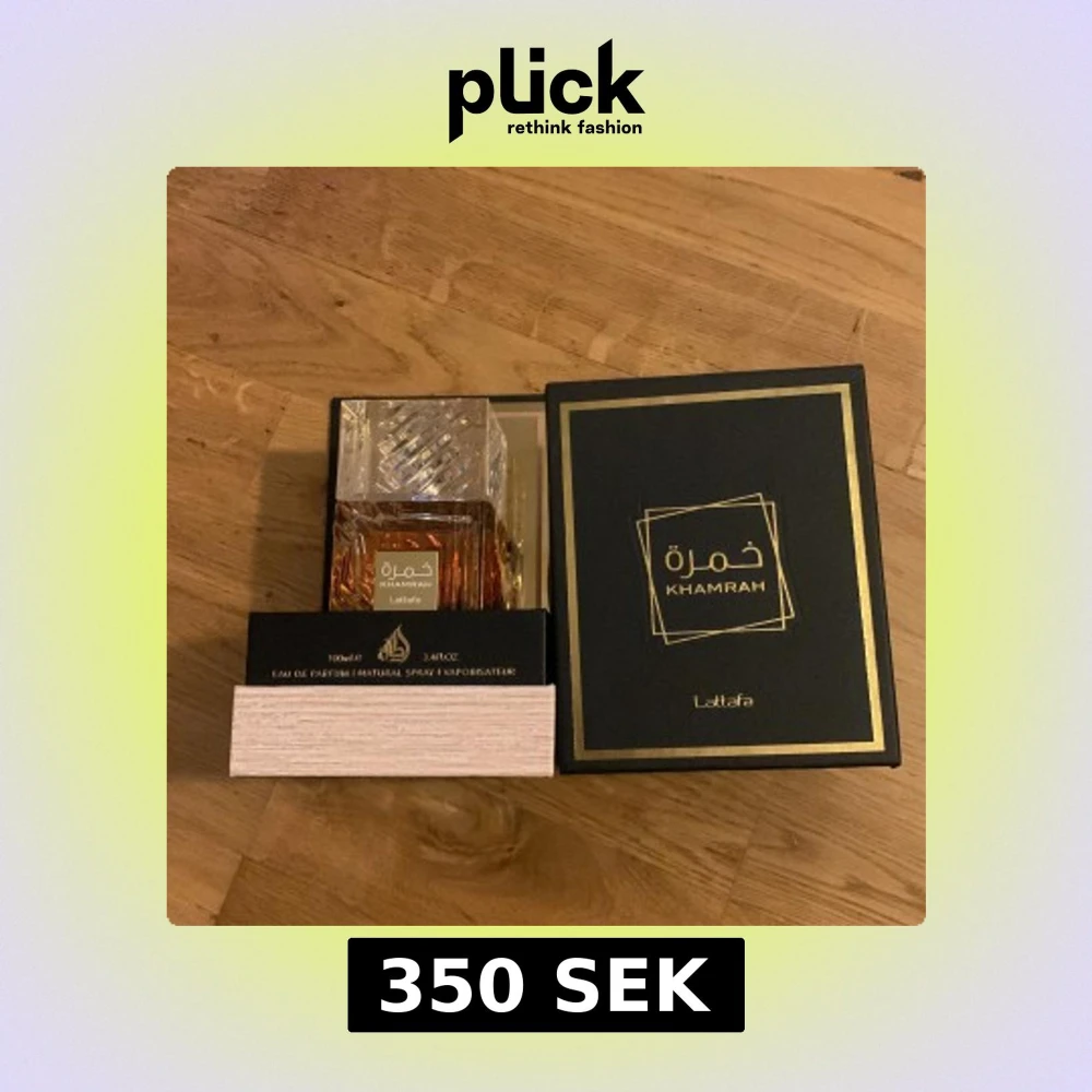 Exklusiv parfym från Lattafa, Khamrah, i en elegant flaska med en kristalliknande kork. Flaskan har en lyxig design med guldiga detaljer och rymmer 100 ml av doften. Perfekt för den som söker en unik och sofistikerad doftupplevelse.