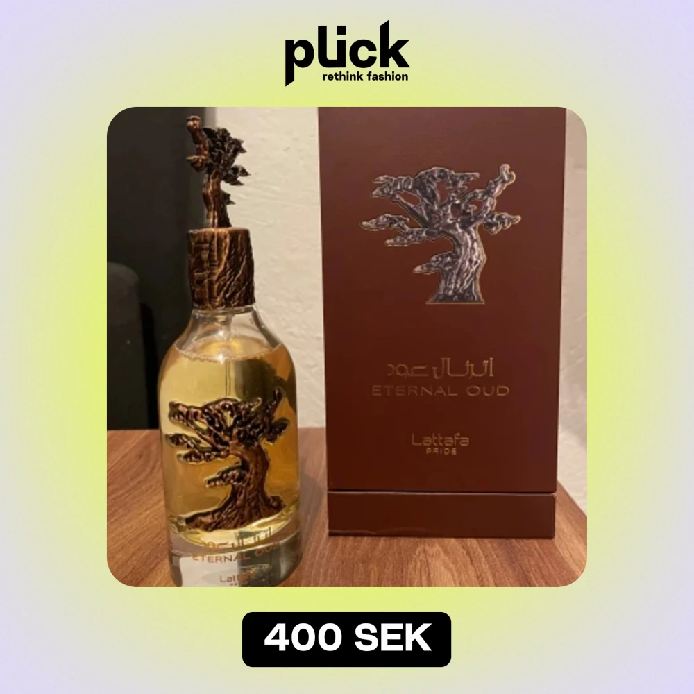 Säljer en lyxig parfymflaska av märket Lattafa Pride, modellen Eternal Oud. Flaskan har en unik design med ett bronsfärgat trädmotiv som sträcker sig över flaskan och korken. Parfymen har en gyllene färg och kommer i en elegant brun förpackning med samma trädmotiv. Perfekt för den som älskar orientaliska dofter och vill ha något som sticker ut på hyllan!