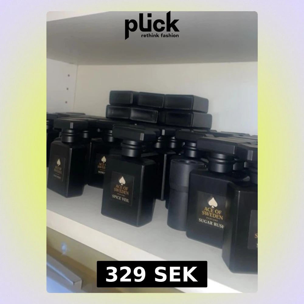 Snygg parfym från Ace of Sweden i en stilren, svart fyrkantig glasflaska med matchande svart lock. Flaskan har en modern och lyxig känsla med guldtext på etiketten. Perfekt för dig som gillar exklusiva dofter och elegant design. Gaia spirit- invictus paco Nomad- D sauvage Sugar rush- ultrá male Spice veil- d0lce the 0ñë Crimson- dunhill lnd0n