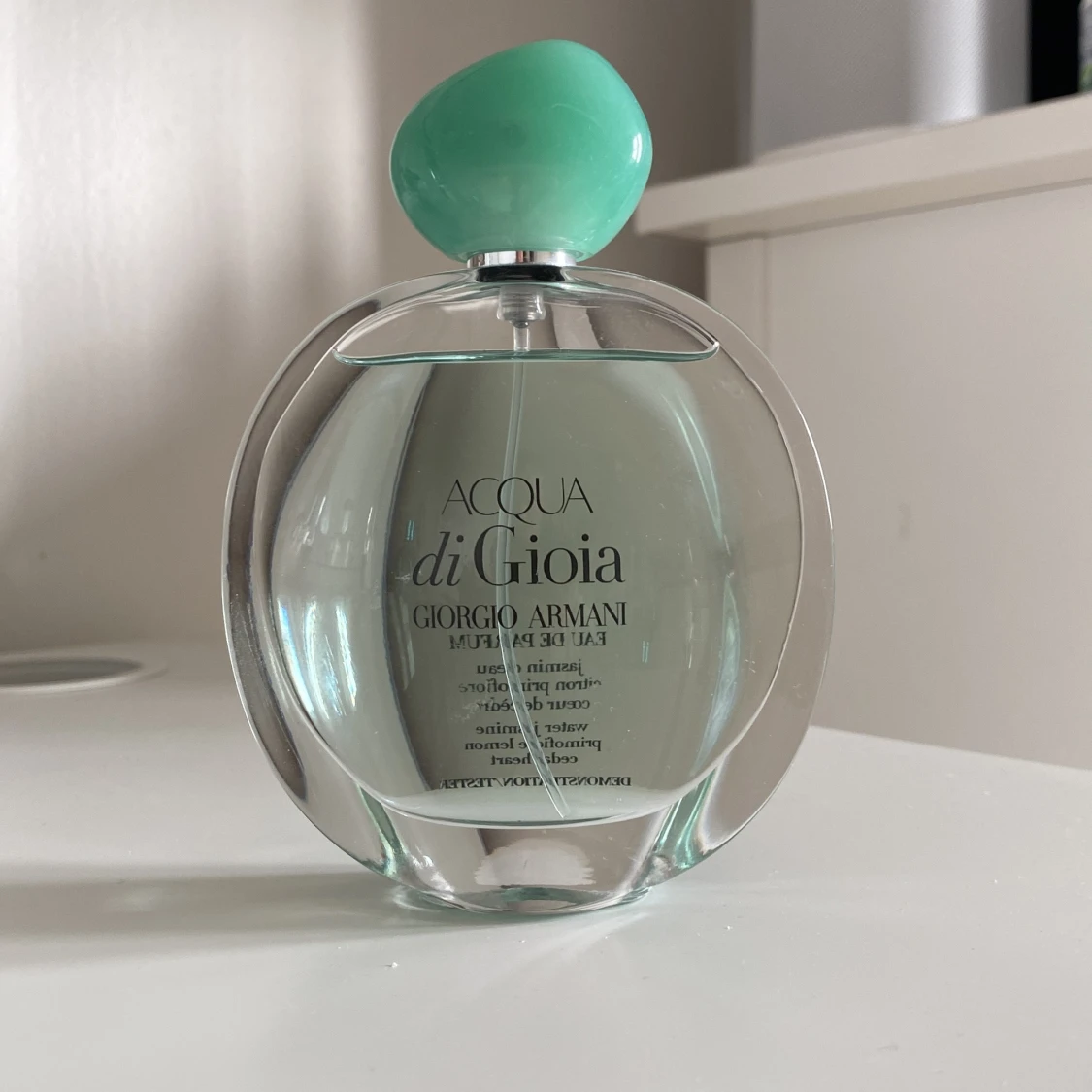 Fräsch parfym från Giorgio Armani, Acqua di Gioia. Den luktar väldigt fräscht och är lätt i sin doft. I sin doft har den water jasmine, primofiore lemon och Cedar heart. Som man ser är den lite använd, innehåller 100ml💞