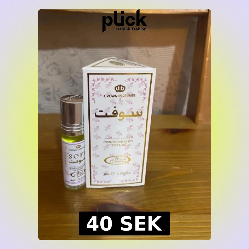 Crown Perfumes Soft är en koncentrerad parfymolja i en liten glasflaska med silverfärgat lock. Förpackningen är vit med rosa detaljer och guldtext. Parfymen är oljebaserad och kommer i en smidig 6 ml flaska, perfekt att ta med sig.