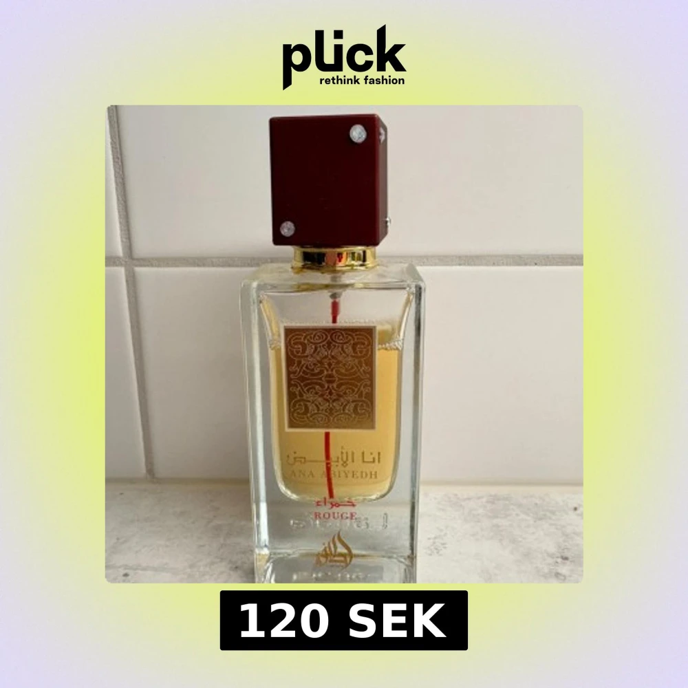 Ana Abiyedh Rouge från Lattafa är en Eau de Parfum i en stilren, fyrkantig glasflaska med gulddetaljer och en mörkröd, kubformad kork med små stenar. Parfymen har en gyllene vätska och flaskan pryds av arabiska och engelska texter i guld. Väldigt lik baccarat rouge doften.
