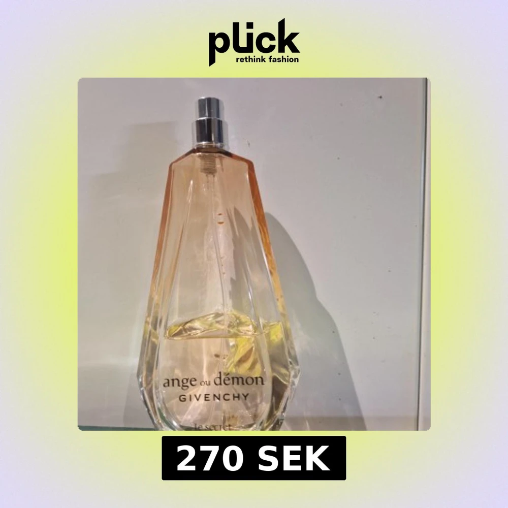 Elegant parfymflaska med en unik, droppformad design. Flaskan är genomskinlig med en ljusrosa nyans och har en silverfärgad spraytopp. Texten 'ange ou démon' och 'le secret' är tryckt på framsidan. Perfekt för den som söker en sofistikerad doftupplevelse. Kvar av parfym: ca 50 procent