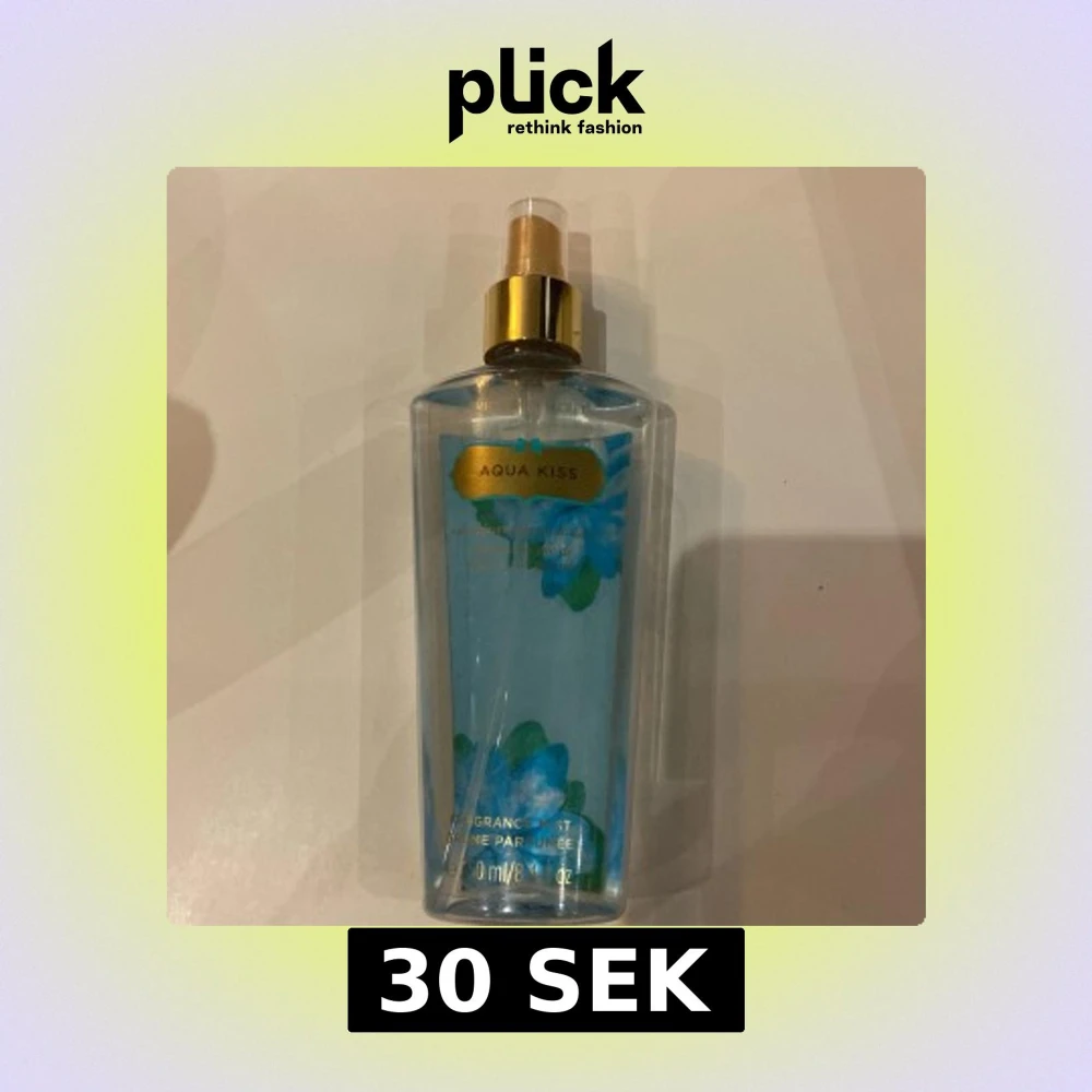 Fräsch body mist med blå vätska och blommigt motiv på flaskan. Flaskan är genomskinlig med gulddetaljer på spraymunstycket och har en elegant, modern design. Doften är lätt och uppfriskande, perfekt för dig som gillar fräscha toner. Köpt för länge sedan