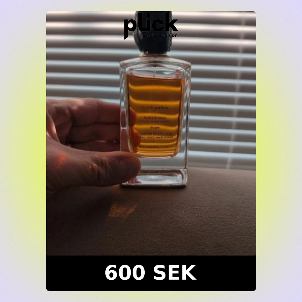 Snygg parfym i en rektangulär glasflaska med svart kork och bärnstensfärgad vätska. Flaskan har stilrena linjer och text i guld på framsidan. Perfekt för dig som gillar lyxiga dofter och elegant design.