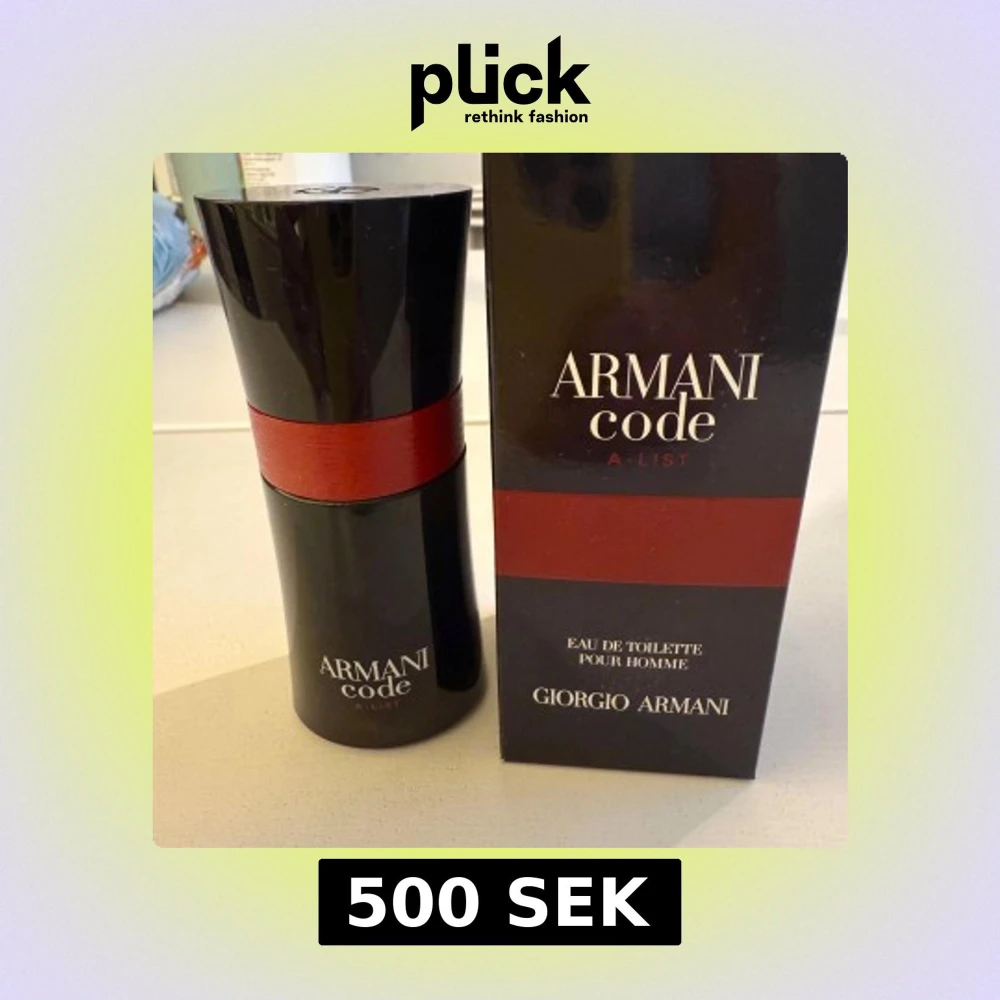 Snygg parfymflaska i svart med röd detalj från Giorgio Armani, modellen Code A-List. Flaskan har en modern, stilren form och kommer med originalkartong. Doften är Eau de Toilette för herrar och ger en exklusiv känsla. Endast tagit ett fåtal droppar från flaskan.