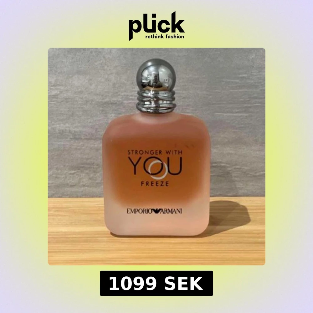 Säljer en elegant parfymflaska av Stronger With You Freeze från Emporio Armani. Flaskan har en stilren design med en frostad glasfinish och en silverfärgad kork. Perfekt för den som vill ha en fräsch och modern doft.